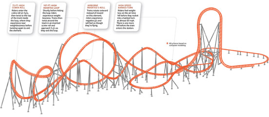 In just two months’ time, riders will crest this same piece of steel, then hurtle down a record-setting 97-degree slope—yes, that’s 7 degrees past vertical—on the steepest and most severe roller-coaster descent in the United States. “When you come over the apex of the curve, you’re lifted forward into the harness,” says Kent Bachmann, the park’s director of design and engineering. “The track actually disappears for a few seconds.” And that’s just the beginning: Fahrenheit will provide 2 solid minutes of corkscrews, barrel rolls and inversions. “That way every time you get on this ride,” Bachmann says, “you can have a different experience.